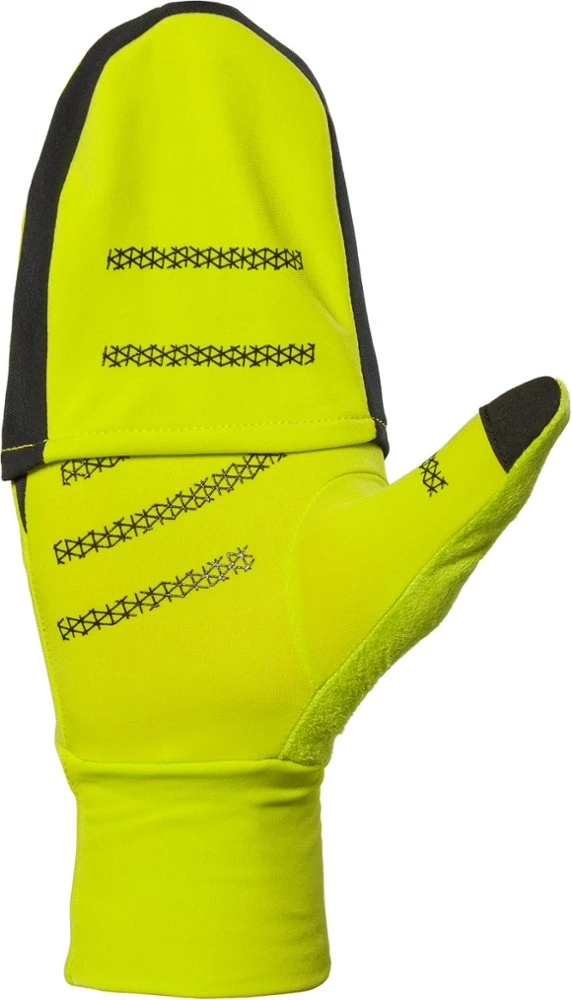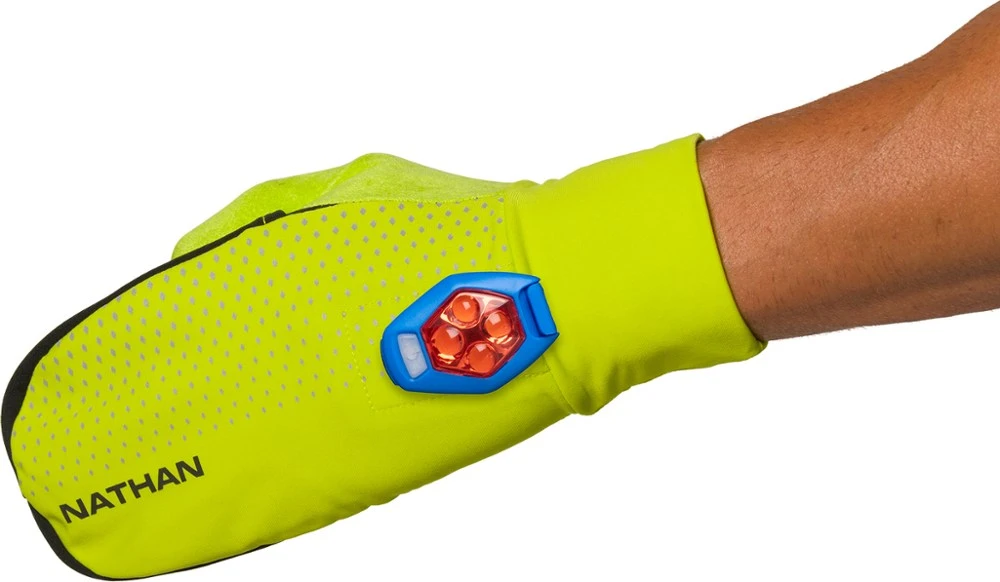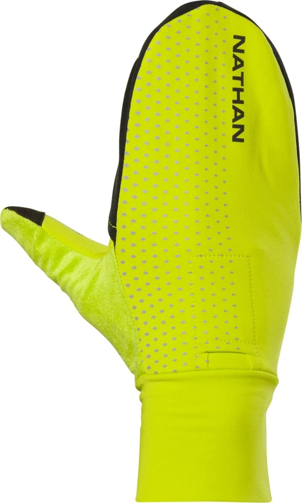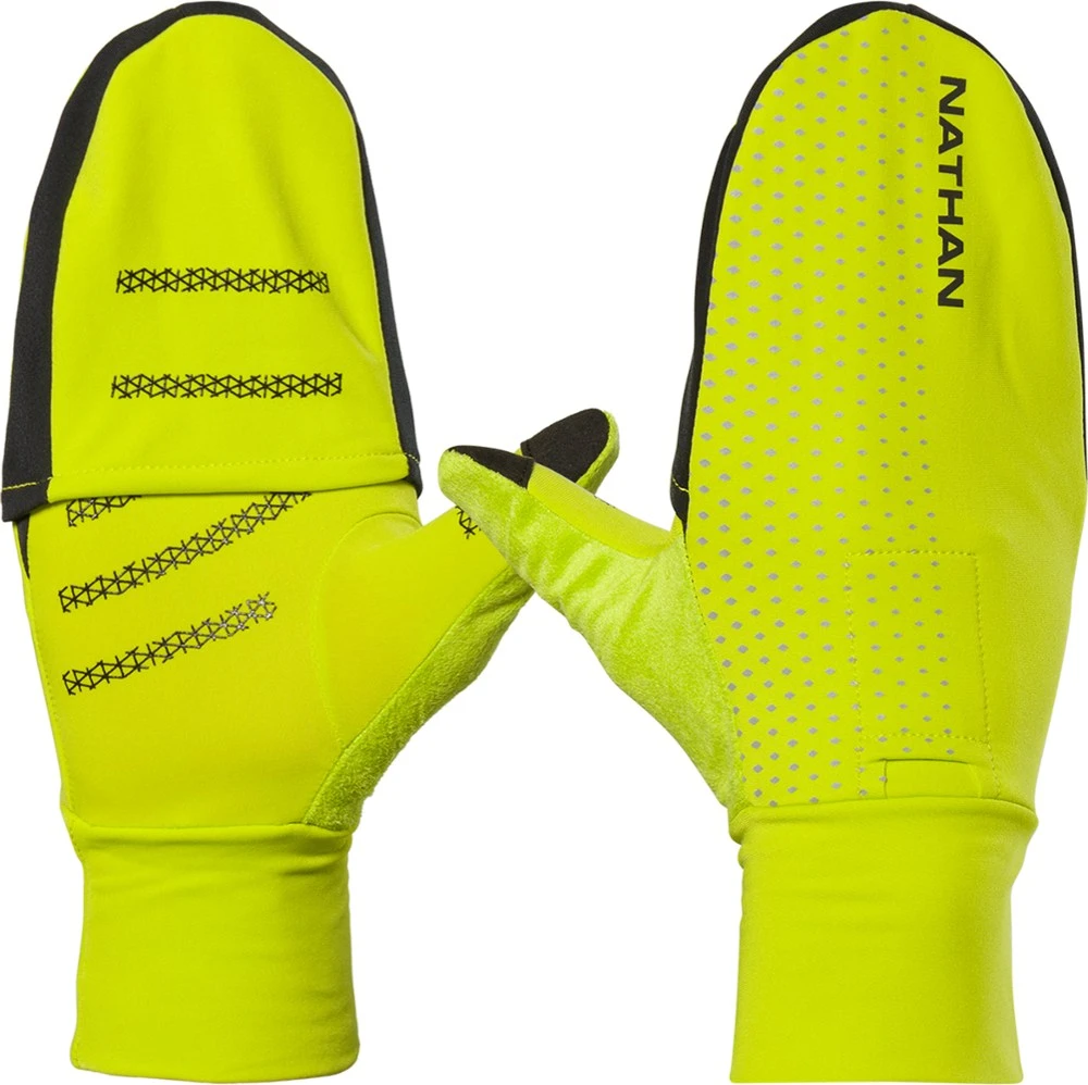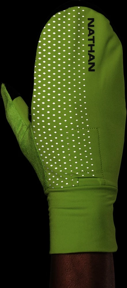 Designed for cold runs and outdoor adventures, the lightweight Nathan HyperNight Reflect Convertible mittens have an eye-catching reflective geometric pattern and can be worn as mittens or gloves.