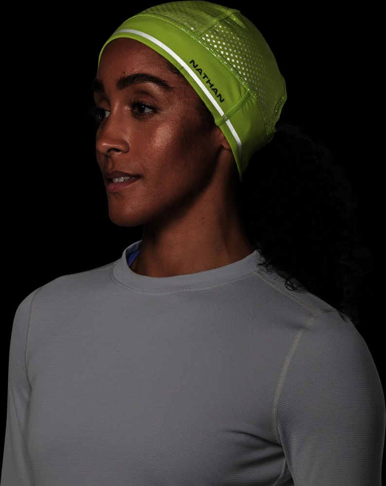 For cool-weather runs that transition from day to night, the Nathan HyperNight Reflect Ponytail beanie provides lightweight warmth and reflective details—and has a special hole for your ponytail.