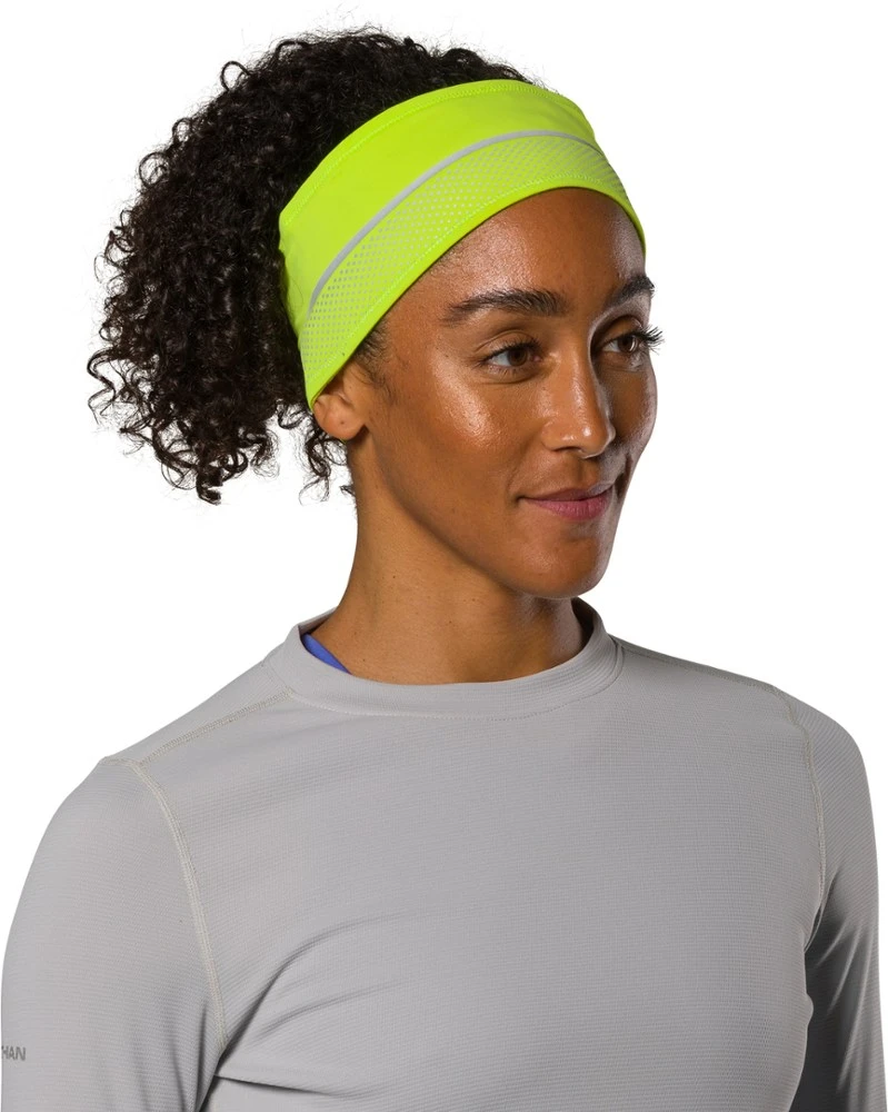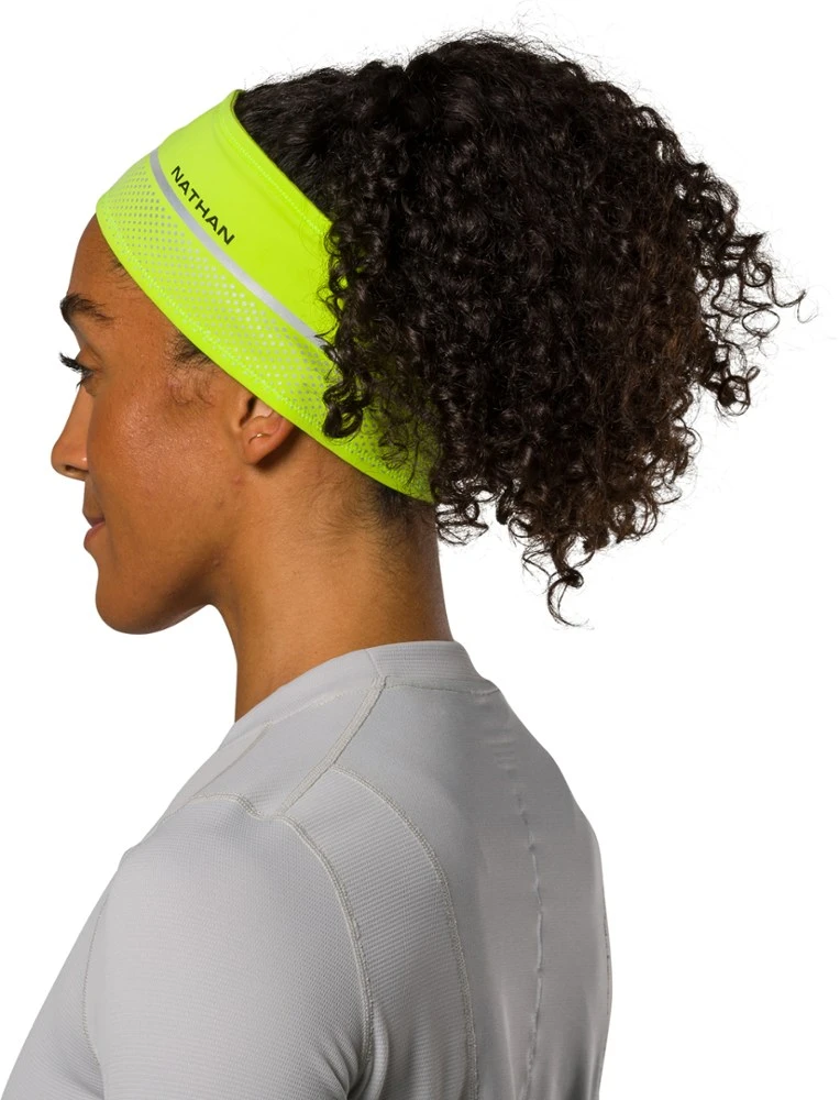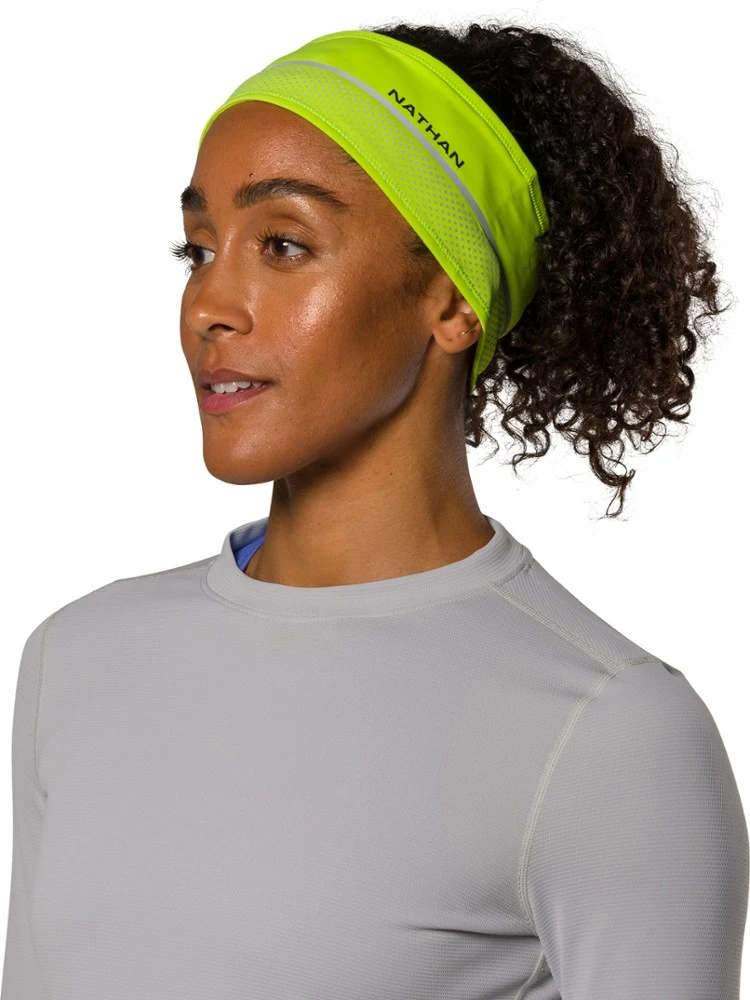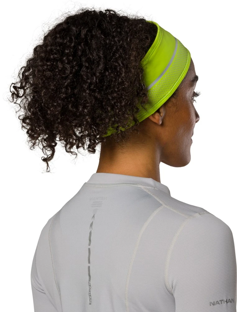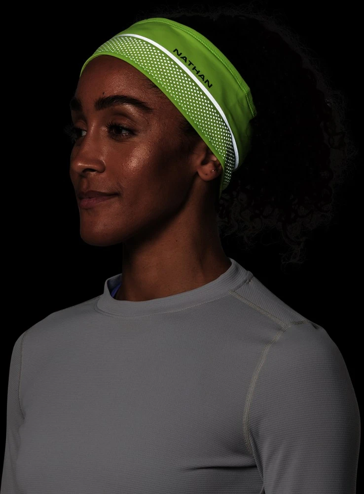 Keep your hair back and your ears protected on cool-weather runs with the Nathan HyperNight reflective headband. Plus, the reflective graphics add visibility for runs in low-light conditions.
