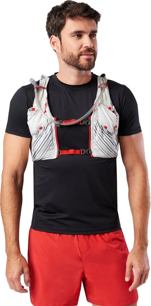 - 2 water-resistant pockets on chest accommodate soft flasks (not included), nutrition, most smartphones and other small essentials