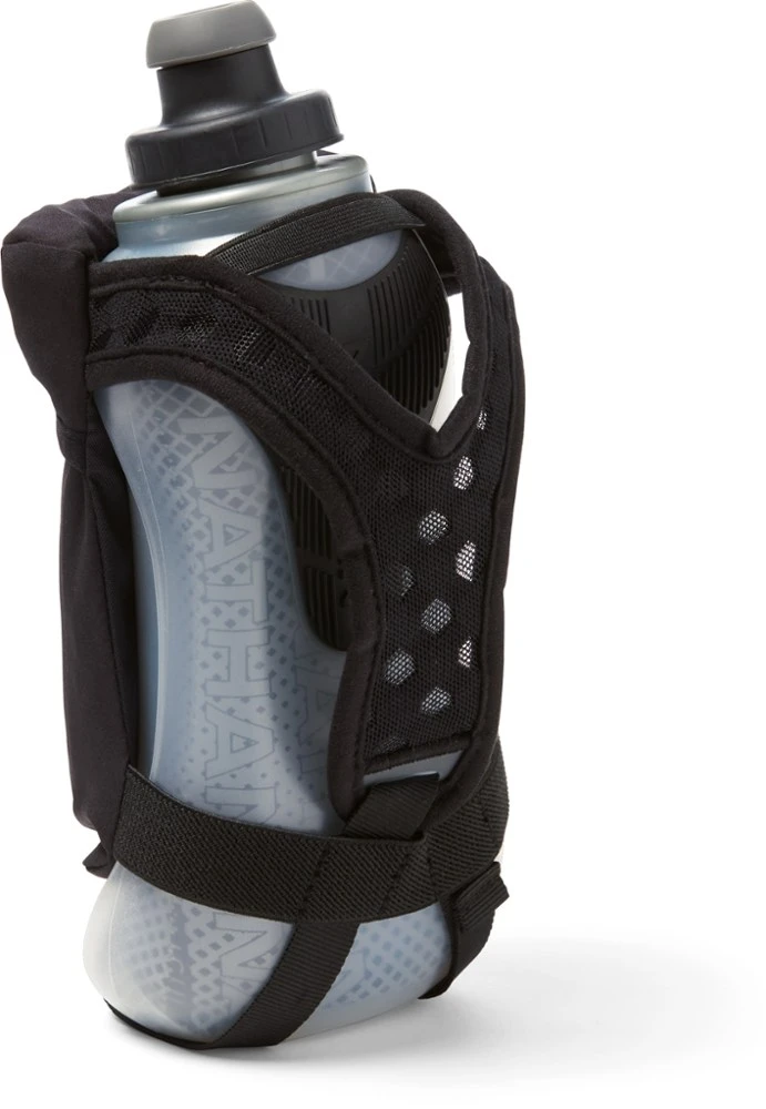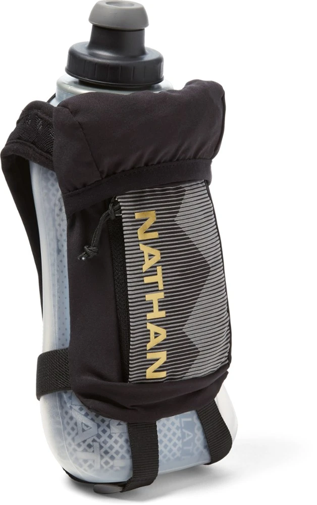 The 18 fl. oz. Nathan QuickSqueeze insulated handheld water bottle is a grip-free flask that keeps H2O refreshingly cool as you crank out the miles. Plus, it has a separate pocket for your phone.