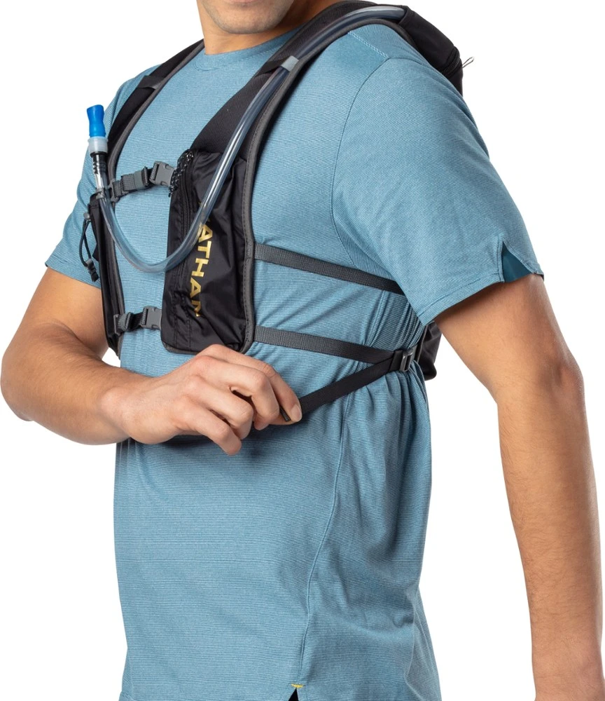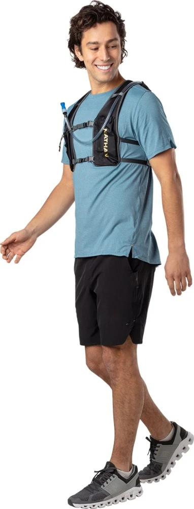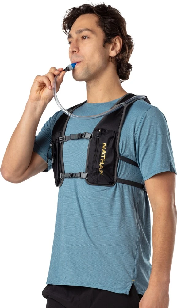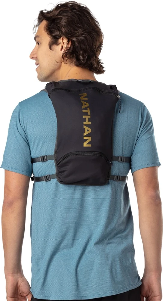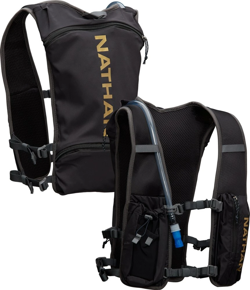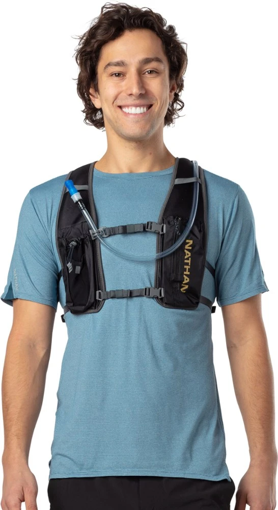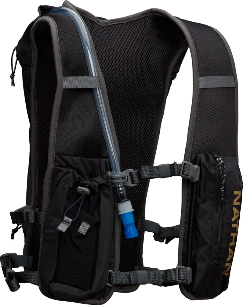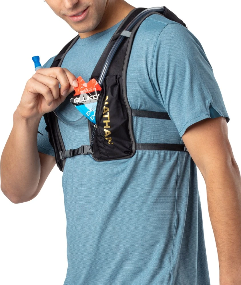 A low-profile, minimalist way to wear your water and bring along essentials on your journey, the Nathan Quickstart 2.0 4 L hydration pack includes a 1.5-liter hydration bladder with hose and valve.