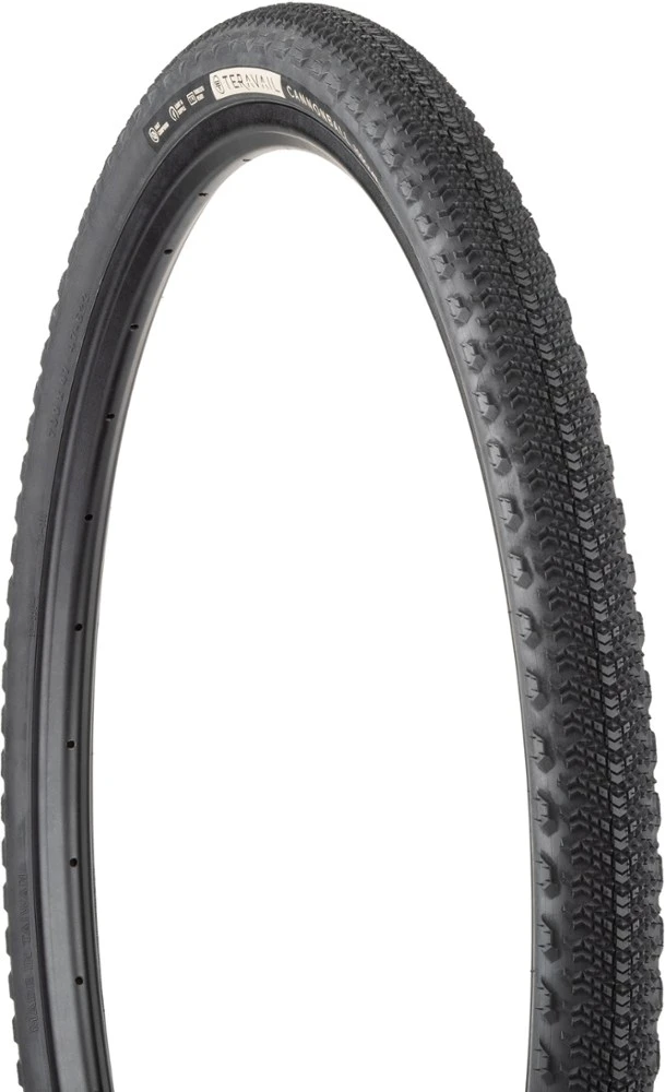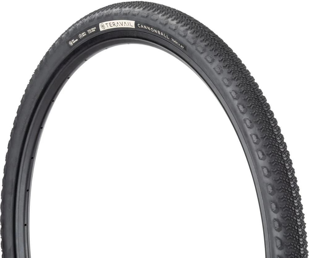 A go-to gravel race tire, the Teravail Cannonball Durable tire boasts a directional, tight-knit center tread that sheds debris to decrease rolling resistance, and side knobs for cornering traction.