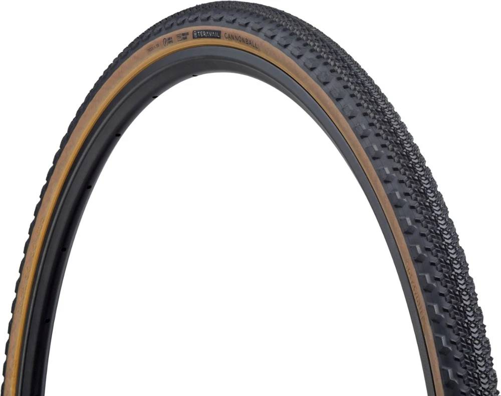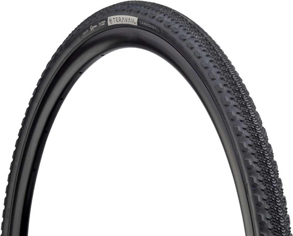 Built for gravel riders, the Teravail Cannonball Light & Supple tire boasts a directional, tight-knit, debris-shedding center tread for less rolling resistance and side knobs for cornering traction.