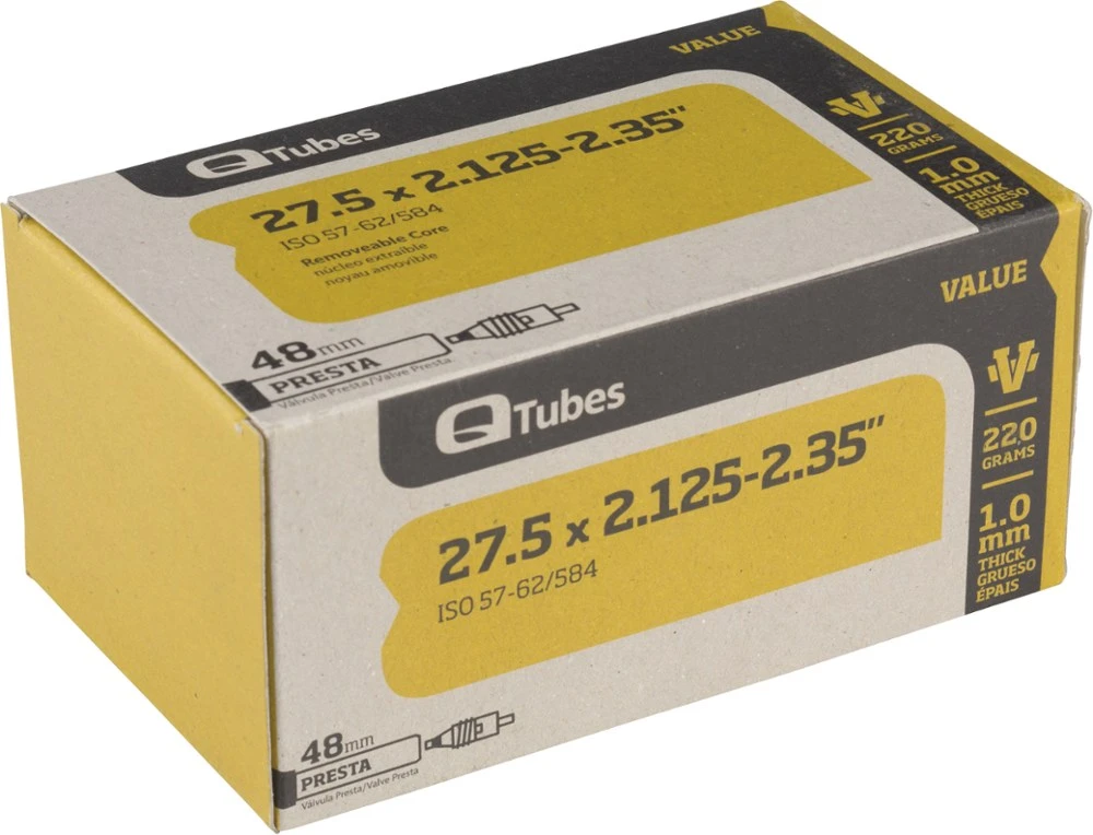 Puncture put a temporary stop to your ride? Get rolling again fast with this Teravail Presta tube. 0.9 mm thick, it includes a removable Presta valve core and fits 27.5 in. wheels 2.125–2.35 in. wide.